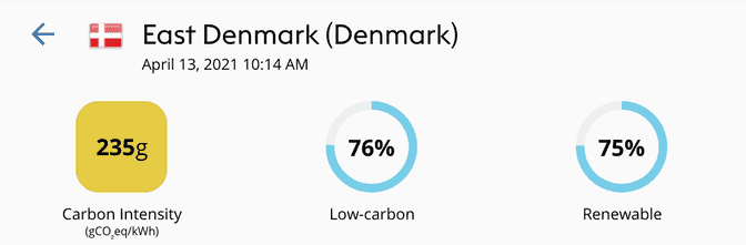 The Electricity Maps App showcases the result of solving the flow-tracing algorithm in real-time. Even though East Denmark has no nuclear generation, some nuclear electricity is still available through the imports, thus creating a small difference between the low-carbon and renewable percentages shown here (nuclear is low-carbon but not renewable).
