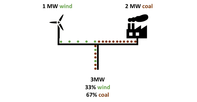 The share of each that is present in the resulting mix is determined by the share of power supplied by each power plant. For example, if a coal power plant produces twice the power of a wind turbine, then we’ll end up with a mix which is twice as coal-intensive as it is wind-intensive. This leads to a mix consisting of 67% coal and 33% wind, as illustrated below.